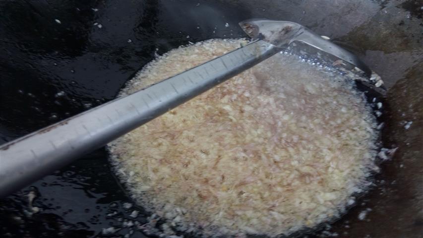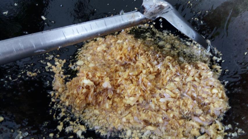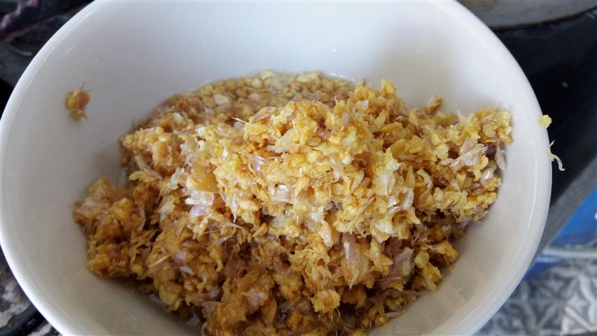 1. เตรียมกระเทียมเจียว อาจจะใช้ครกตำหรือเครื่องบด แล้วค่อยๆเจียวในน้ำมันไฟอ่อน ไม่งั้นไหม้แล้วจะขม