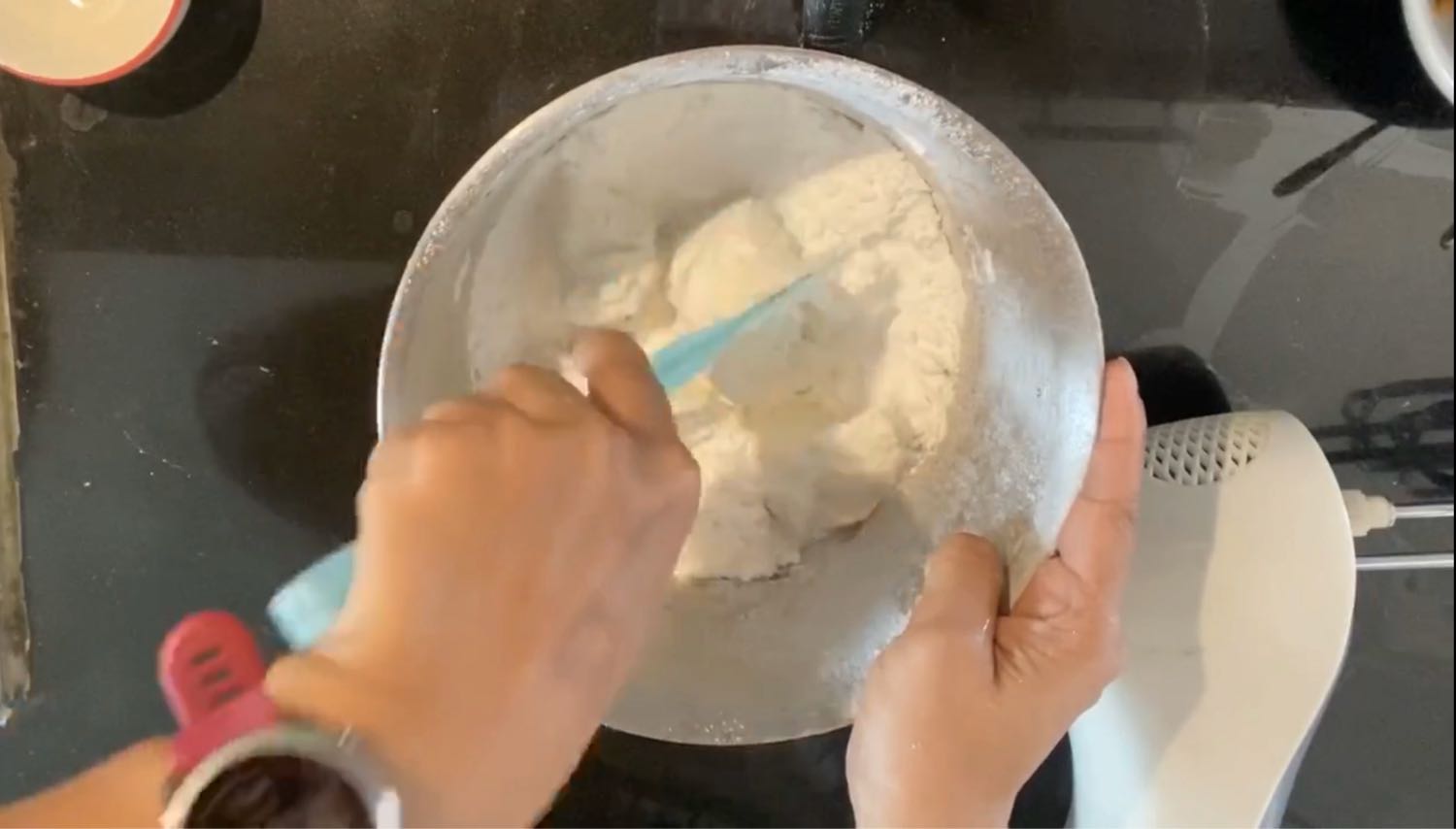 แล้วใส่แป้งสาลี แล้วใช้มือนวดๆๆ จนเนื้อเนียน