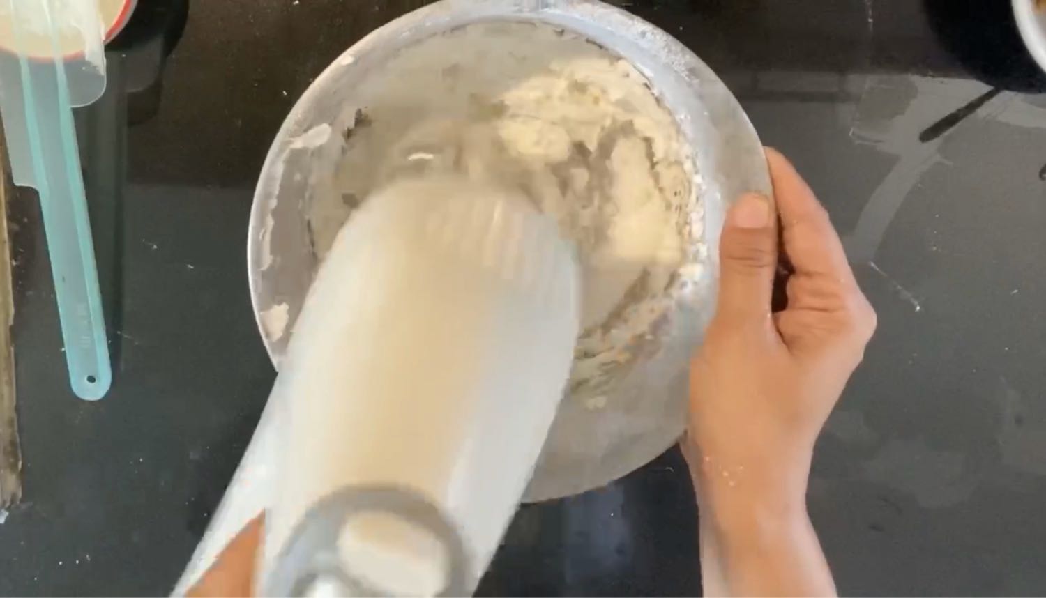 ใช้ไม้พายคลุกเคล้าเพื่อไม่ให้น้ำตาลไอซ์ซิงฟุ้งกระจาย หลังจากนั้นใช้เครื่องตีให้เข้ากัน
