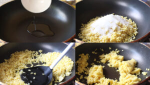 4.ตั้งกระทะ ใส่น้ำมั น มะพร้าว ถั่วเขียว น้ำตาลทราย เกลือป่น ผัดจนทุกอย่างเข้ากัน ระหว่างผัดไปก็ใช้ตะหลิวยีถั่วไป