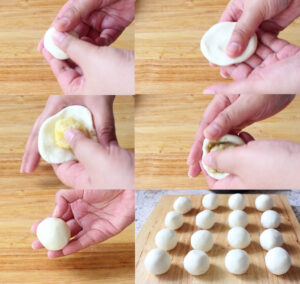 6.นำแป้งที่พักมาตั ด แบ่งขนาดน้ำหนักประมาณ 30 กรัม แล้วคลึงเป็นวงกลม