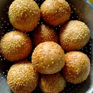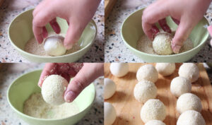 8.หลังจากนั้นนำไปคลุกง า ขาว จะเอาน้ำลูบหมาดๆที่แป้งก่อนชุบงาก็ได้ค่ะ ง า จะได้ติดแน่นไม่หลุดเยอะเวลาทอด