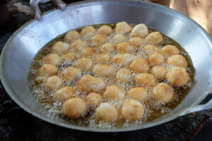 9. ตั้งกระทะจนน้ำมั น เดื อ ด นำขนมไปทอดไ ฟ กลางๆไปทางอ่อน ระหว่างทอดต้องคอยคน ขนมเริ่มพองขึ้นมา ก็นำ