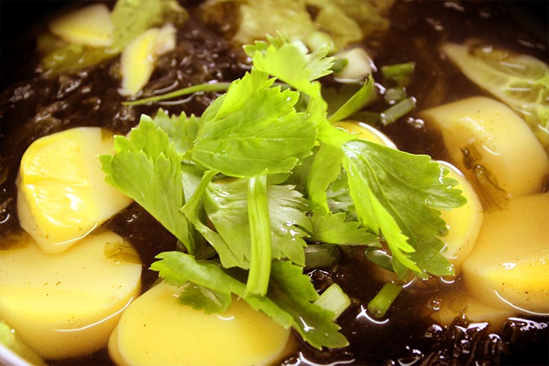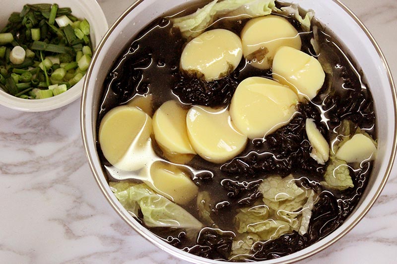 ► เติมน้ำเปล่าลงไปแล้วนำสาหร่ายแห้ง ผักกาดขาวหั่นชิ้นเล็ก ๆ มาใส่รวมกัน