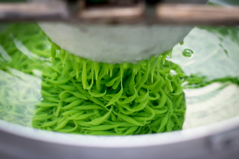 -ตักส่วนผสมแป้งใส่เครื่องกดลอดช่อง กดแป้งเป็นเส้น ๆ สลับกับหยุดให้แป้งลงไปในน้ำเย็นจัด