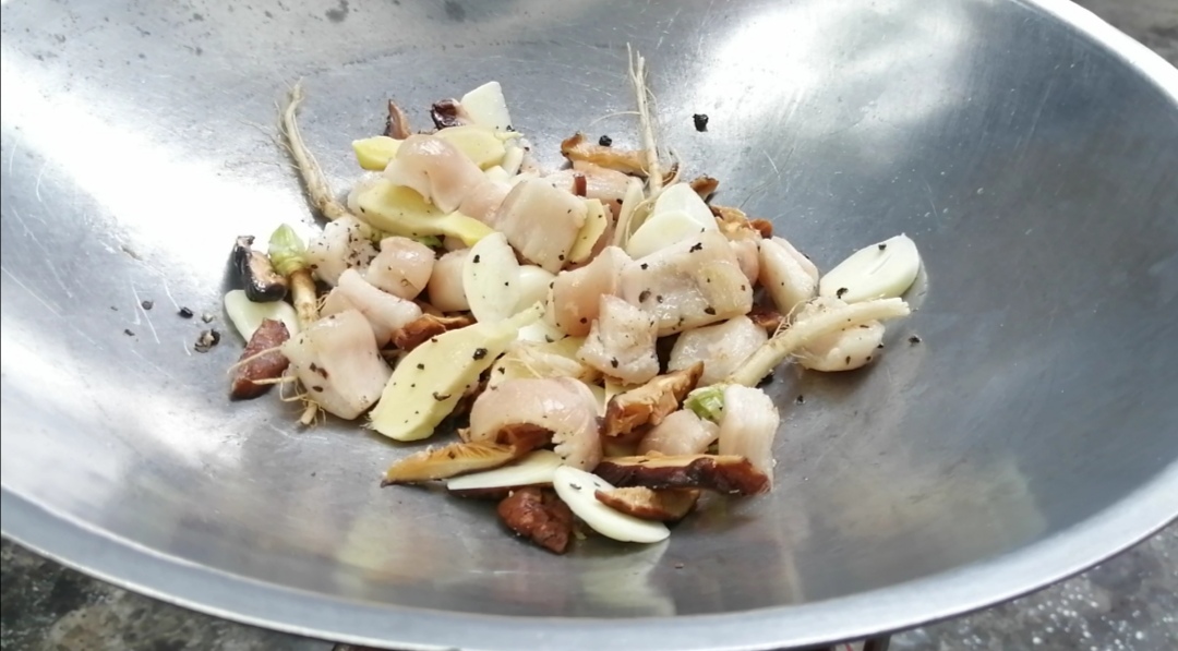 6.ใส่ขิง รากผักชี กระเทียม พริกไทยดำ เห็ดหอมลงไปผัดกับมันหมูให้หอม