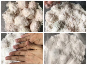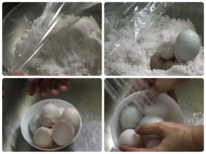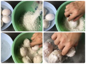2.นำไข่ที่แช่น้ำส้มสายชูแล้วมาคลุกเกลือให้ทั่วแล้วเรียงลงบนภาชนะที่แห้ง ทำจนครบ เมื่อครบแล้วนำเกลือที่เหลือ