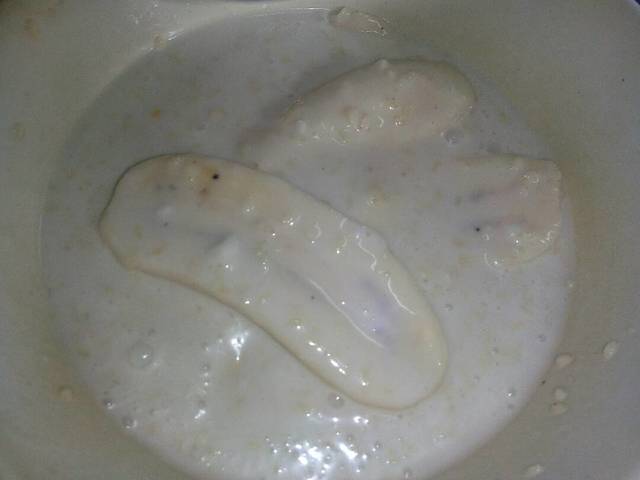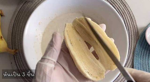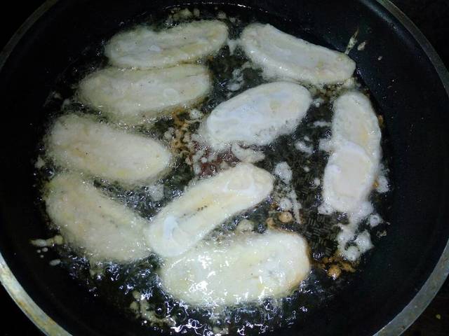 5. หั่นกล้วยตามความยาว 3-4 ชิ้นต่อ 1 ลูก ขึ้นอยู่กับขนาดของกล้วยแต่ละลูก นำไปชุบแป้งตามส่วนผสมที่ได้เตรียมไว้ เมื่อน้ำมันเดือดให้ใส่ลงไปในกระทะจนเต็ม