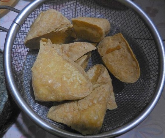 – ตัดเต้าหู้เป็นชิ้นสามเหลี่ยม นำไปทอดให้เหลือง