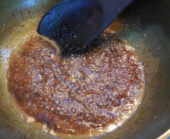 – ผัดสามเกลอกับน้ำมันให้หอม ใส่น้ำตาลลงไป เคี่ยวให้เหนียวและเป็นสีน้ำตาลเข้ม