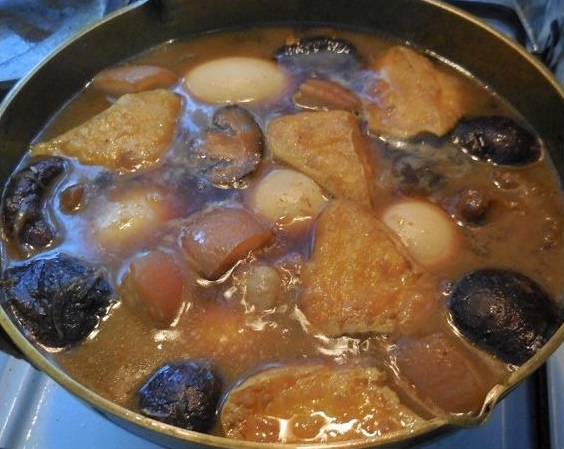 – เติมน้ำลงไป 1 ทัพพี รอให้เดือด ใส่หมูสามชั้น ไข่ เห็ดหอม เต้าหู้ ลงผัดให้เข้ากัน ใส่ซีอิ้วดำ ปรุงรสด้วย น้ำปลา เกลือ ผัดให้เข้ากันดี