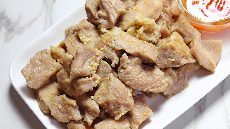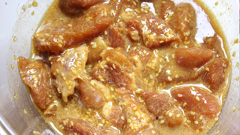 “หมูนุ่มหมักนำมันงา” เป็นสูตรเดียวกันกับที่นิยมใช้ในร้านอาหารปิ้งย่างชาบู แต่เพิ่มน้ำมันงาลงไปทำให้มีรสชาติหอม