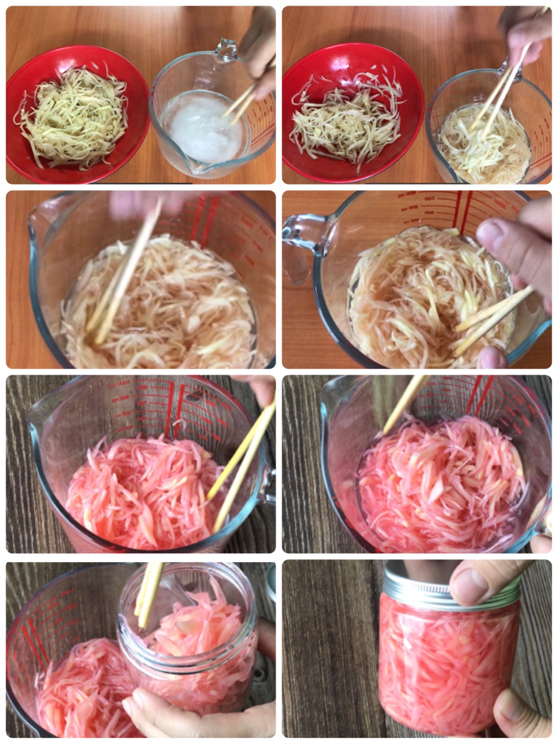 – นำขิงลงไปแช่ในน้ำดองขิง ของจะค่อยๆเปลี่ยนเป็นสีชมพูอ่อนๆ ถ้าต้องการเพิ่มสีชมพูก็เพิ่มได้ตามชอบ