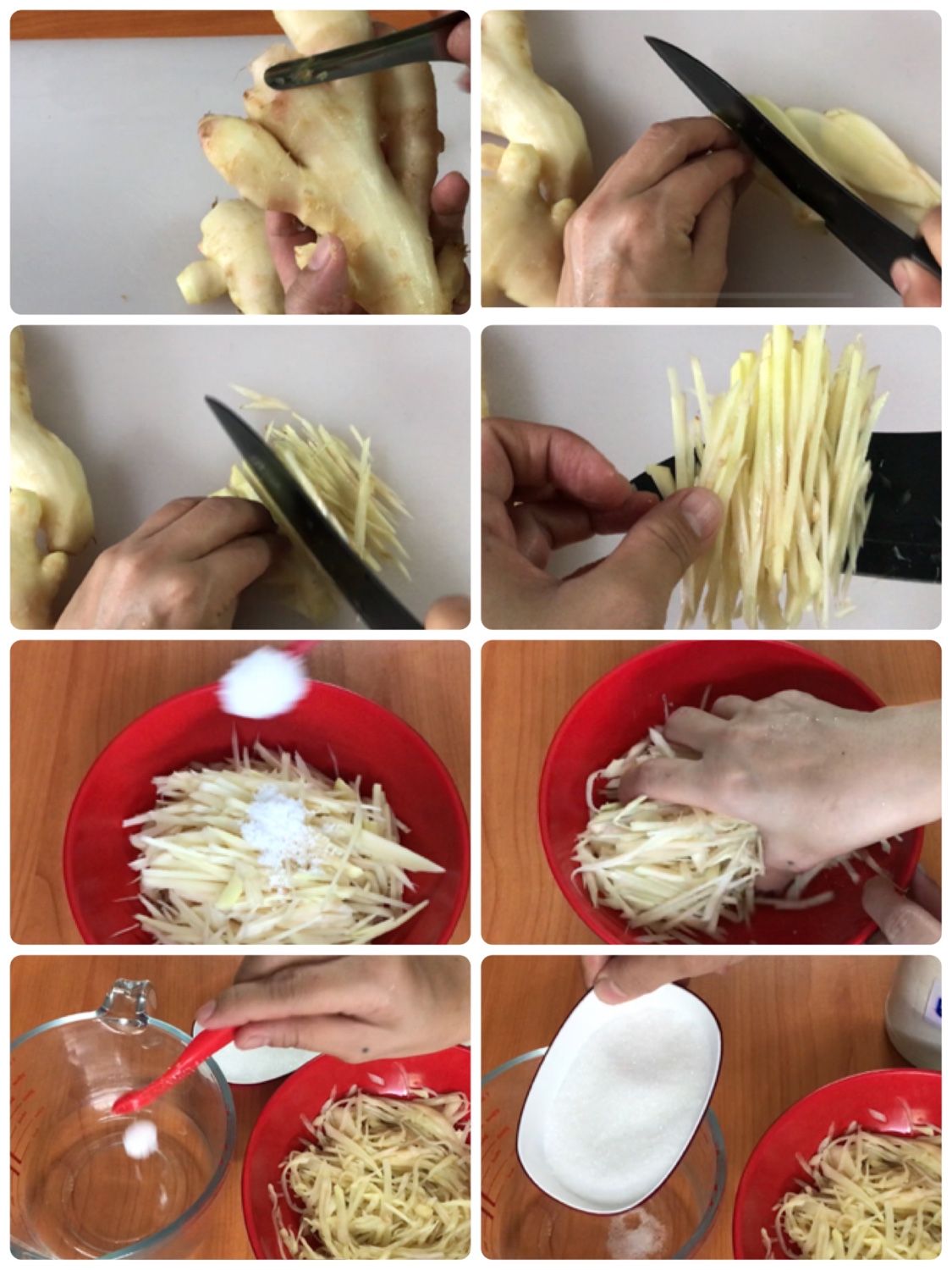 – ผสมน้ำสำหรับดองขิง โดยผสม น้ำส้มสายชู เกลือ และน้ำตาลรวมกัน