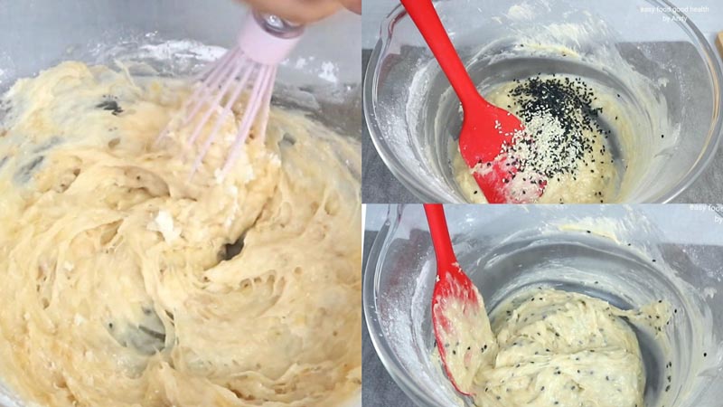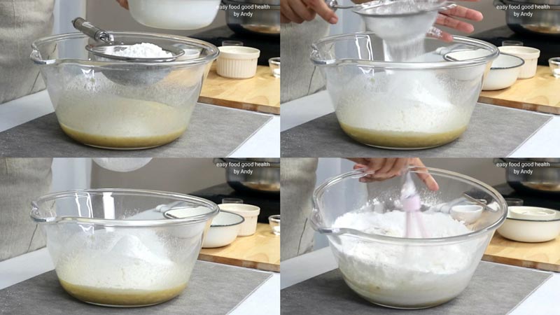 ★ ร่อนแป้งและผงฟูลงไปผสม แล้วตะล่อมจนแป้งละลายไม่เป็นเม็ด ขั้นตอนคนแป้งย้ำว่าอย่าคนนานนะคะ ตะล่อมแค่แป้งไม่เป็นเม็ดคือพอ
