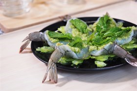 3.นำกุ้งที่แช่น้ำปลาไว้แล้วออกจากตู้เย็น จัดจานด้วยมะระอ่อนฝานบาง ๆ ราดด้วยน้ำจิ้มซีฟู้ดวาซาบิ และตกแต่งด้วยใบสะระแหน่สดตามชอบ
