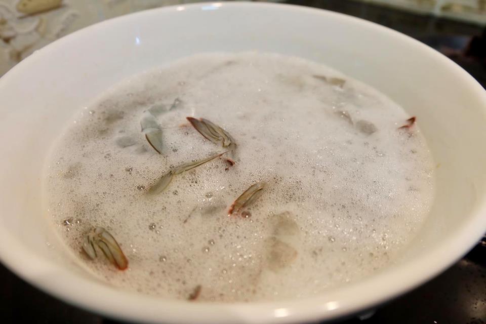 2 นำกุ้งลงแช่โซดาแล้วพักไว้
