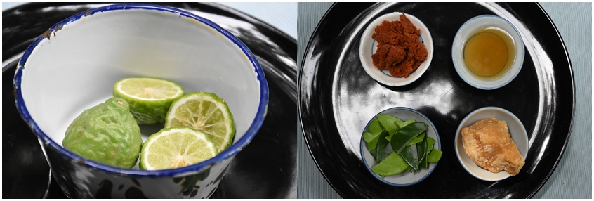 – ลูกมะกรูดผ่าครึ่งเอาเมล็ดออก 1 – 2 ลูก