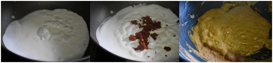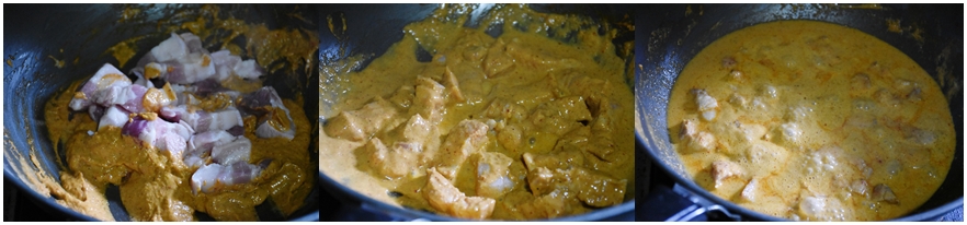 -ตั้งกระทะใส่กะทิลงไปพอเดือด จากนั้นใส่พริกแกงเผ็ดลงไป คนให้กะทิกับพริกแกงเข้ากันไม่ต้องรอให้แตกมันมากเกินไปเนื่องจากเป็นแกงคั่ว