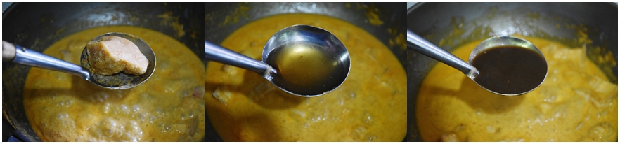 -นำหมูสามชั้นใส่ลงไปผัดให้เข้ากันพอสุกจากนั้นใส่หางกะทิตามลงไปถ้าข้นมากเพิ่มน้ำเปล่าได้เล็กน้อยเคี่ยวประมาณ 10 นาทีให้หมูสามชั้นพอเริ่มนิ่ม