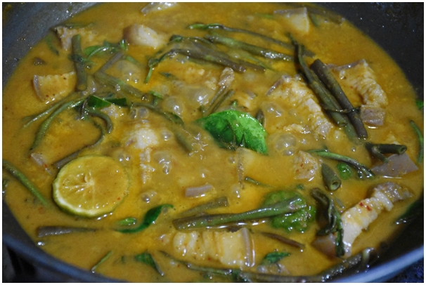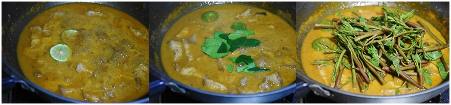-ใส่ลูกมะกรูดที่ผ่าไว้ลงไป ตามด้วยใบมะกรูดและผักบุ้งที่หั่นไว้ เคี่ยวต่อด้วยไฟอ่อนให้ผักบุ้งอ่อนนิ่มและน้ำแกงเข้าเนื้อผักบุ้ง