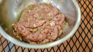 1.นำหมูสั บ ใส่ลงในภาชนะสำหรับผสม ตอกไข่ไก่ไป ตามด้วยสามเกลอ ผงปรุงรส ซอสปรุงรส และน้ำตาลทราย