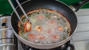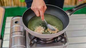 3.ตั้งกระทะเปิดไ ฟ ปานกลางใส่น้ำมันรอให้ร้อนแล้วปั้นหมูให้ได้ชิ้นพอดีคำลงไปทอด