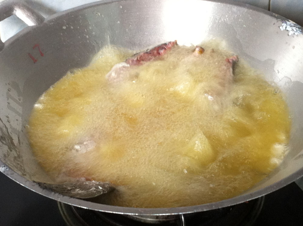 นำปลามาขอดเกล็ด ผ่าหลังและนำก้างตรงกลางออก ตั้งกะทะน้ำมันให้ร้อนจัดแล้วใช้ไฟปานกลาง รอจนปลามีสีเหลืองทอง