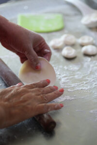 7. ม้วนให้เป็นก้อนกลมๆ พักไว้สักสองสามนาที แล้วจึงกดให้แบน ตามด้วยคลึงจนกลายเป็นแผ่นกลม
