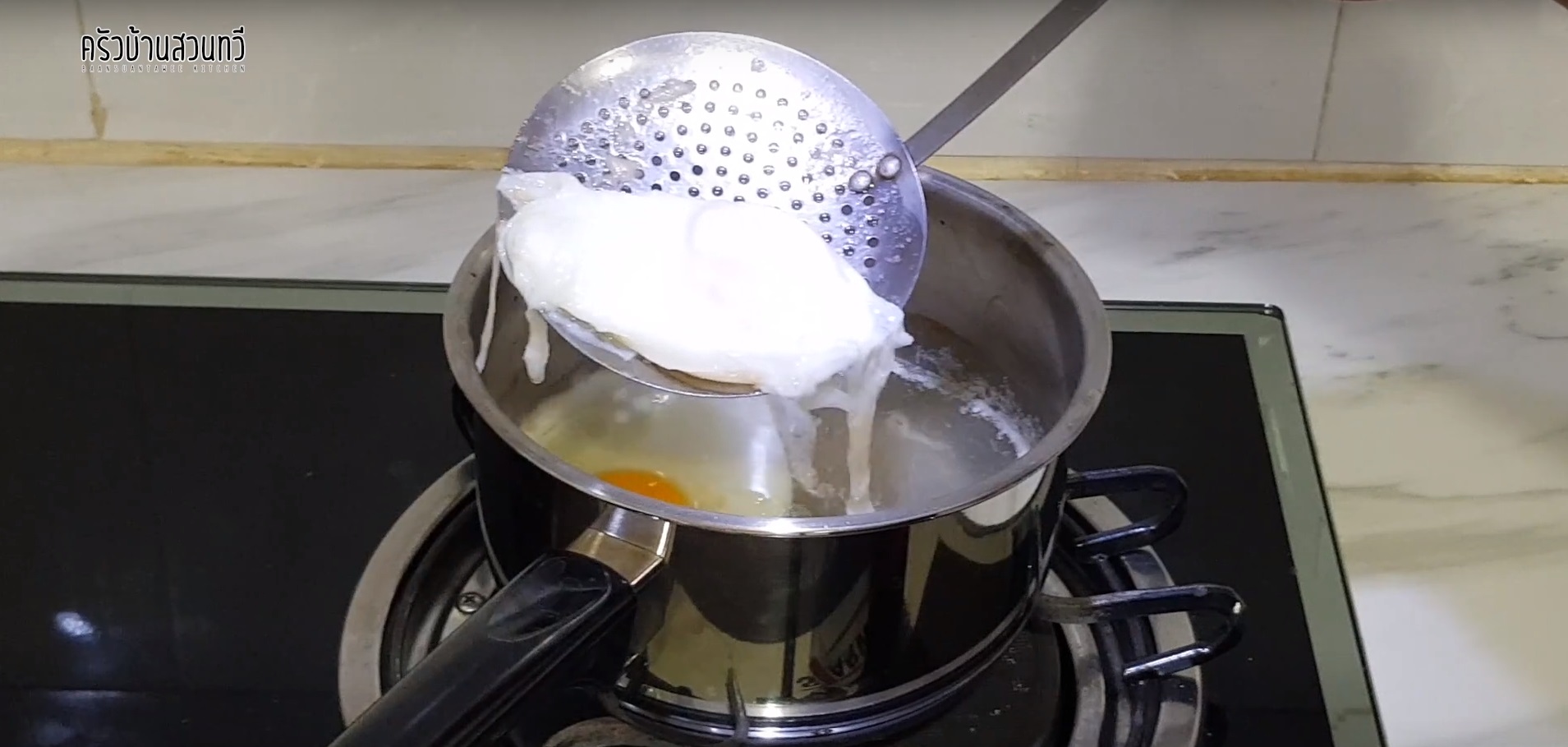 10. ตอกไข่ใส่ถ้วยรอไว้นะครับ พอน้ำตาลของเราได้ที่แล้ว(ให้ร้อนแต่ไม่เดือด) ให้เราวนน้ำเป็นวงกลม แล้วใส่ไข่ลงไปตรงกลางหม้อครับ จากนั้นรอขาวเซตตัว เราก็กลับด้านซักหน่อยครับ ต้มจนไข่สุกในระดับที่เราต้องการ แล้วตักขึ้นได้เลยครับ