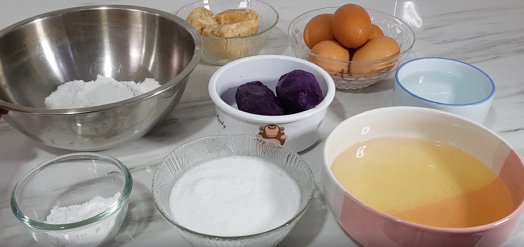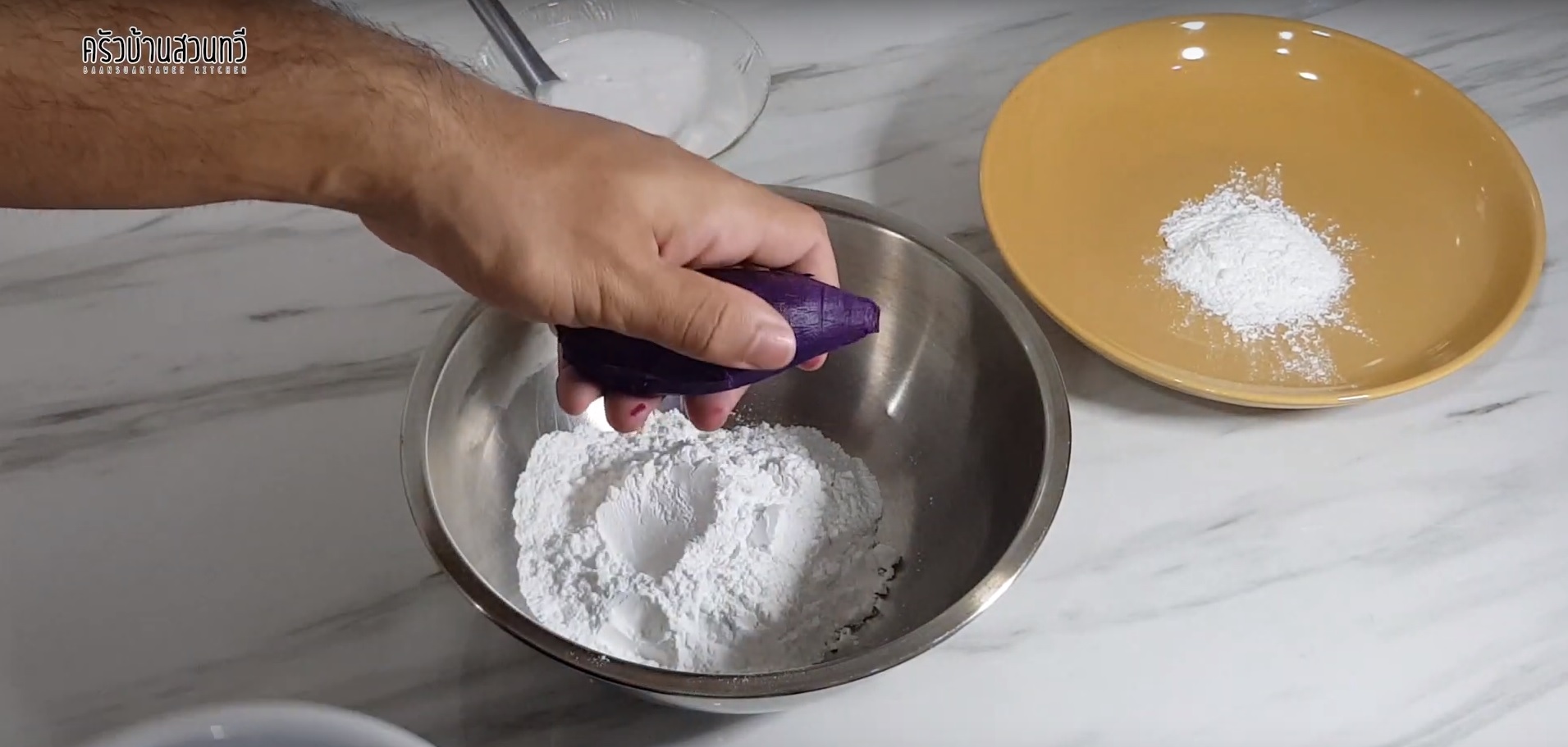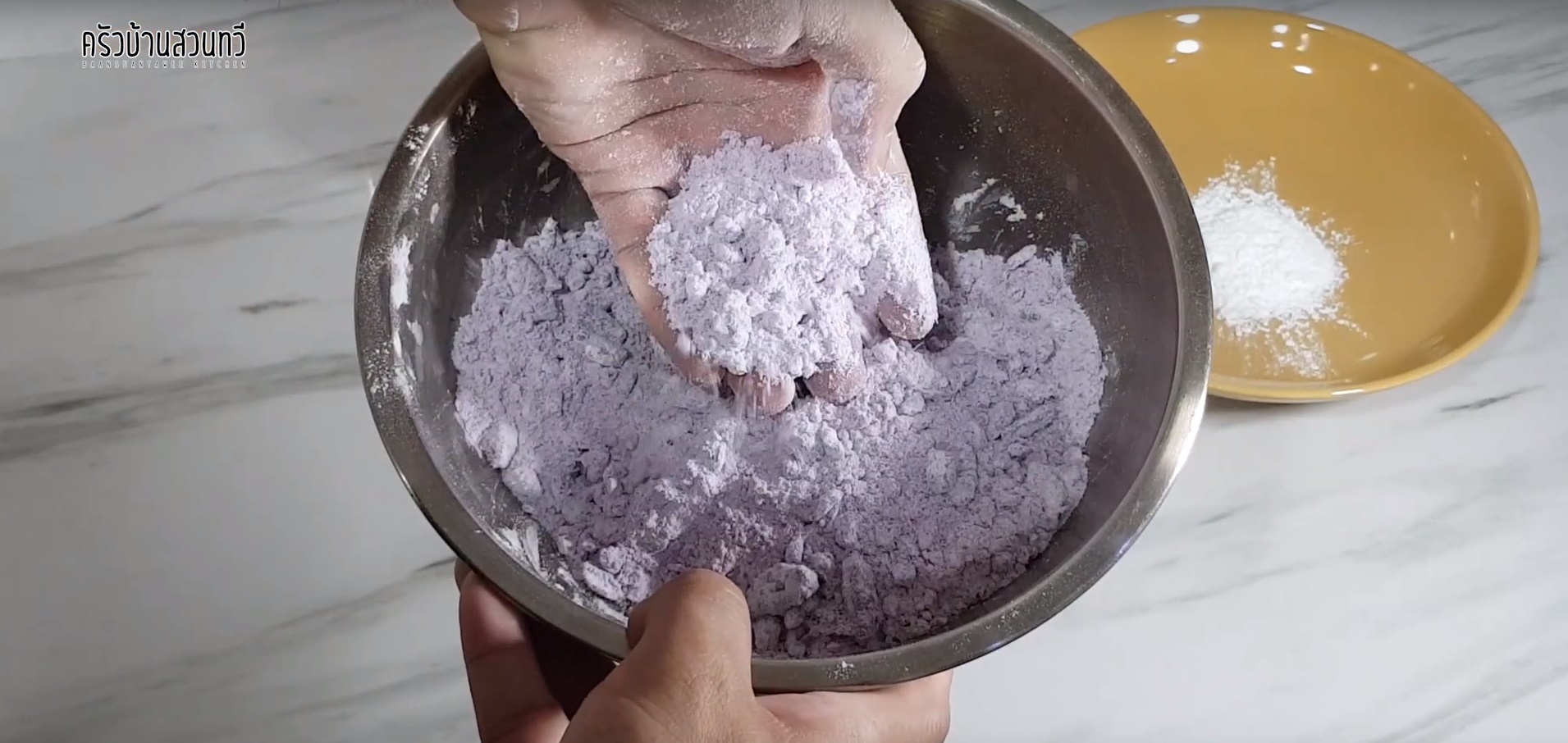 1. นำแป้งข้าวเหนียว(1) ผสมกับมันม่วงญี่ปุ่นนึ่งสุก ปลอกเปลือกออก ขยำให้เข้ากันจนละเอียด ตัวแป้งจะออกมาเป็นทราย ๆ