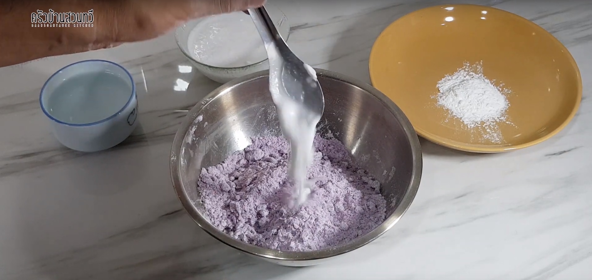 2. ค่อยๆเติมหัวกะทิหรือส่วนที่เป็นของเหลวลงไป (ถ้าชอบมันๆ ก็ใส่แต่หัวกะทินะครับ) แต่ถ้าชอบแบบพอดีๆ ก็ใส่น้ำผสมลงไปครับ สัดส่วนปรับตามชอบเลยนะครับ อันนี้ที่ไม่บอกสัดส่วนเพราะว่า แป้งแต่ละที่จะมีความแตกต่าง ความอ่อนแก่ของมันม่วงแต่ละที่ก็ต่างกันนะครับ(ทำให้ความชื้นในมันม่วงแต่ละที่ไม่เท่ากันครับ เลยให้ค่อยๆ ใส่น้ำแล้วนวดจนได้ที่จะดีกว่าครับ)
