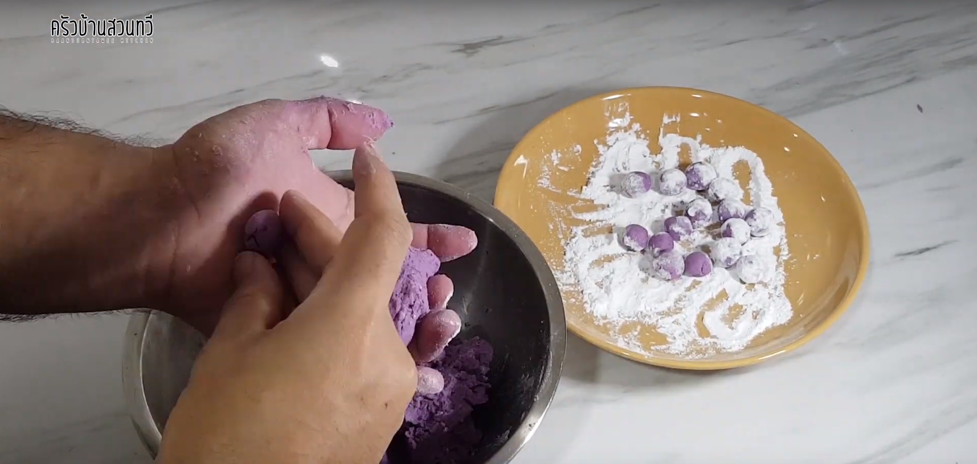 3. นำแป้งที่นวดจนได้ที่แล้วมาปั้นเป็นก้อนกลม ขนาดตามต้องการ หลังจากปั้นให้คลุกแป้งข้าวเหนียว(2) หรือเรียกว่าแป้งนวลไว้นะครับ เพื่อป้องกันไม่ให้แป้งบัวลอยติดกันครับ