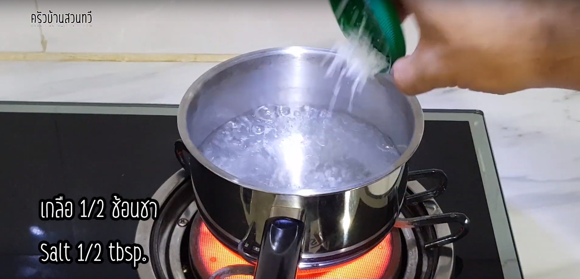 4. ตั้งน้ำให้เดือด แล้วใส่เกลือลงไปเล็กน้อยนะครับ เกลือจะทำให้บัวลอยสีตกน้อยลงเมื่อเรานำไปใส่ในน้ำกะทินะครับ และเพิ่มรสชาติ