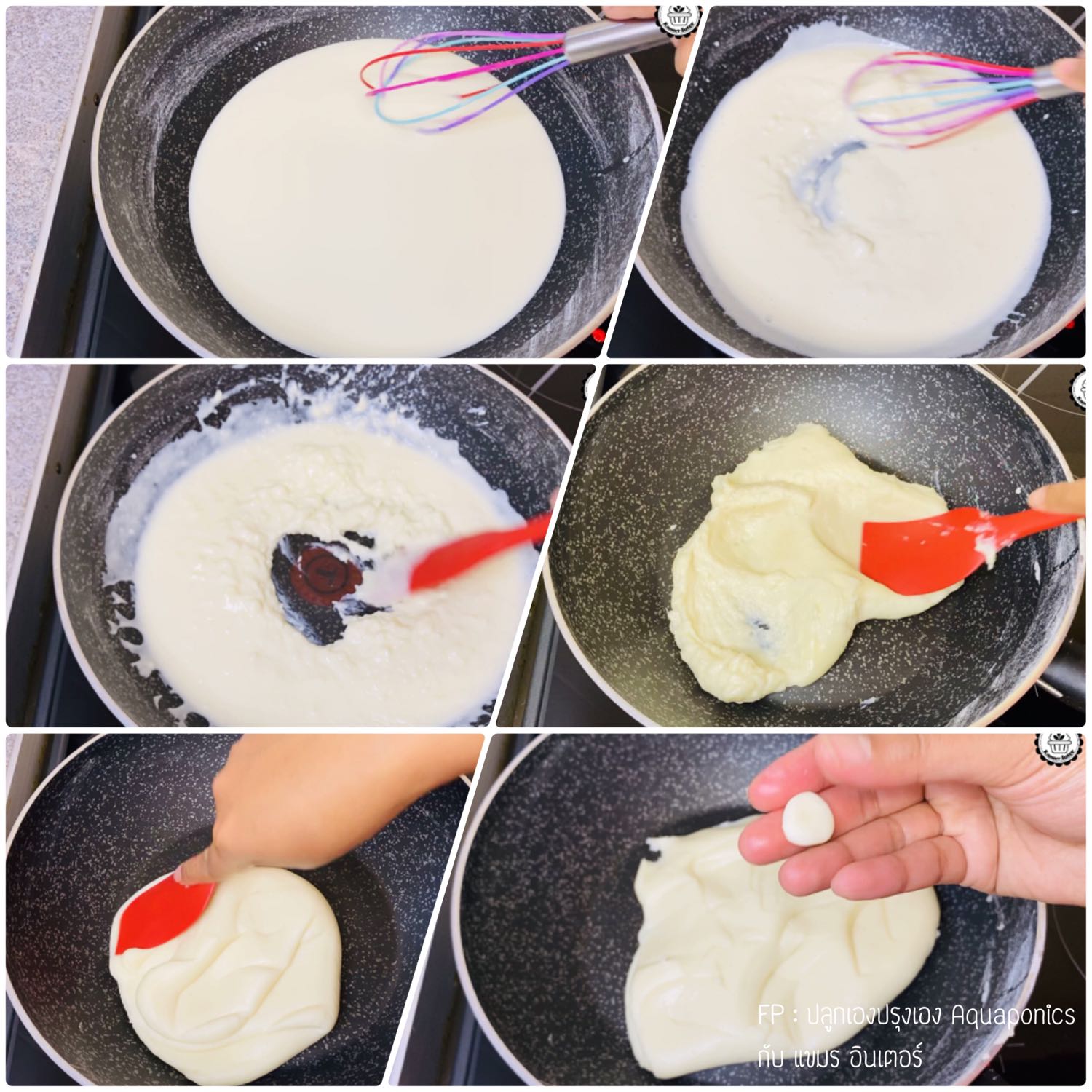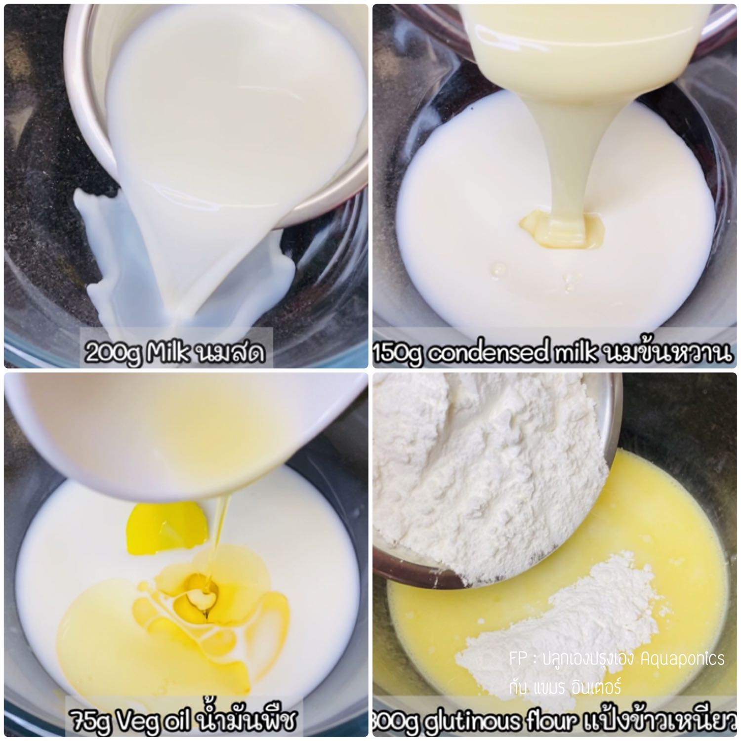 2. มาเตรียมในส่วนของแป้งโมจิ โดยเทนมสด นมข้นหวาน น้ำมันพืช และแป้ง ลงในชามผสม คนทุกอย่างให้เนียนเป็นเนื้อเดียวกัน เทใส่กระทะและทำการเคี่ยว