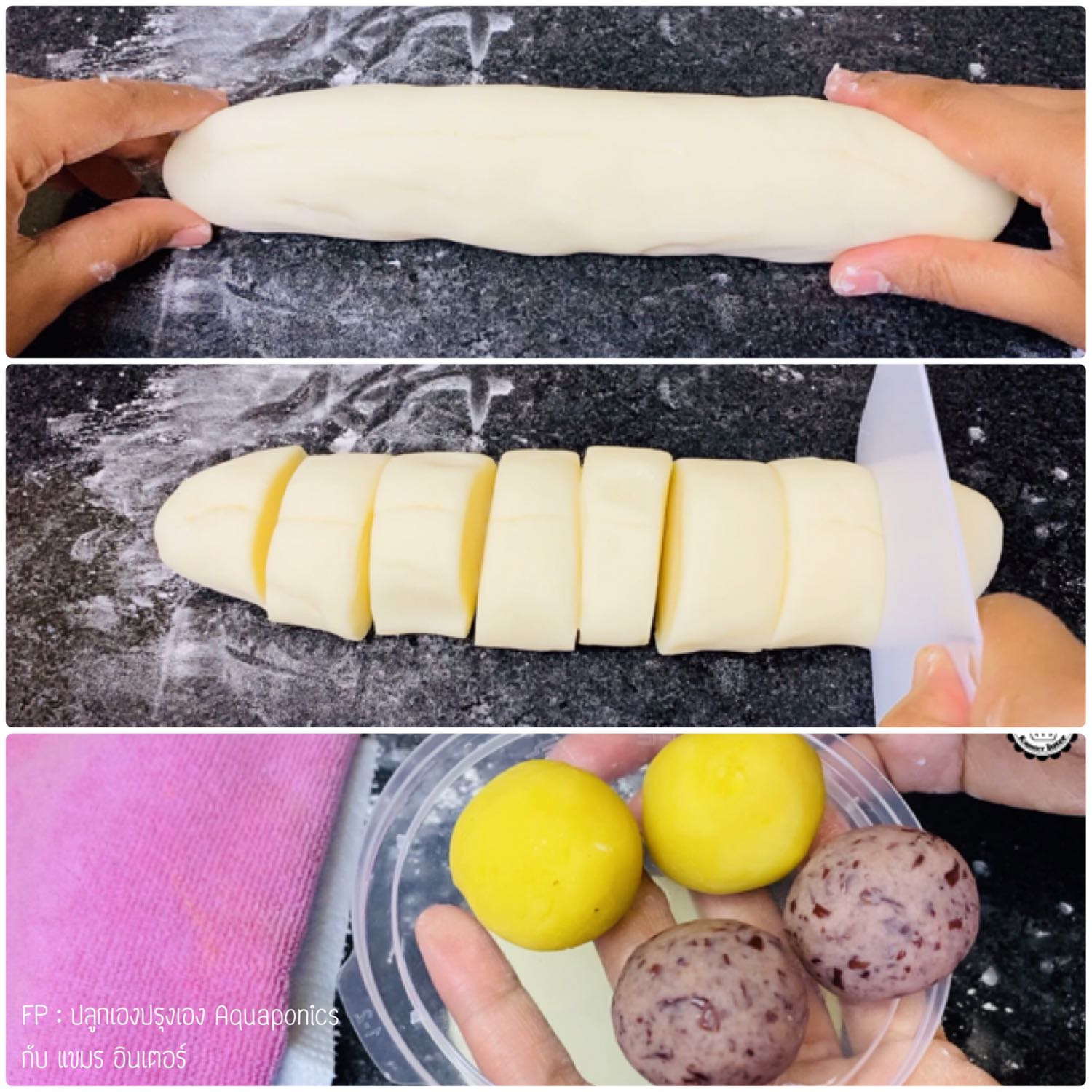 4. นำแป้งที่ผัดได้มานวดเบา ๆ ก่อนทำการตัดแบ่งให้ได้ขนาดเท่า ๆ กัน ไส้ที่จะห่อวันนี้มีไส้ถั่วแดงกวนกับไส้ถั่วเขียว