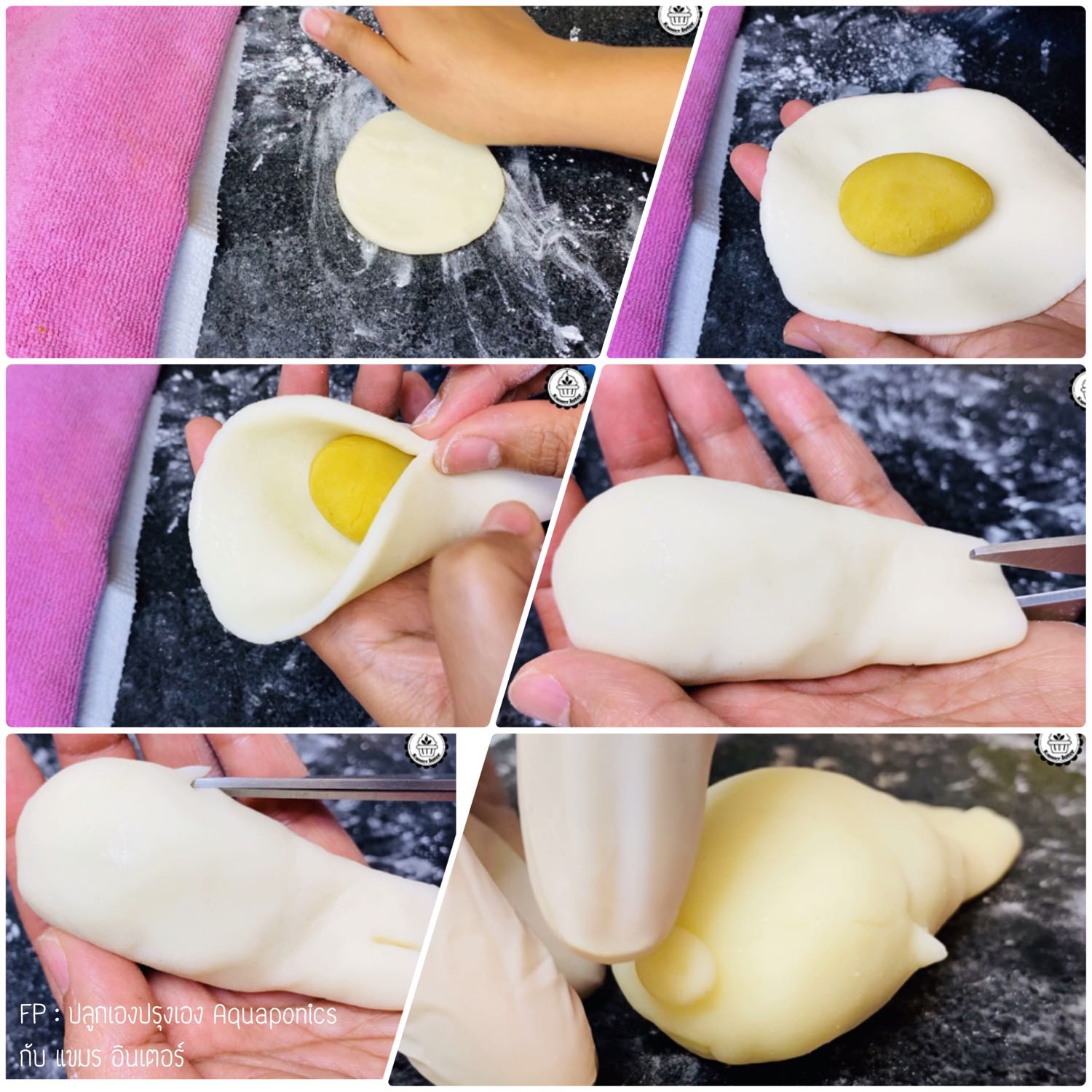 5. เอาแป้งที่ตัดแบ่งไว้นำมาปั้นก้อนกลมและใช้อุ้งมือแผ่ให้แบน หรือจะใช้ที่คลึงช่วย วางไส้ตรงกลางและปิดไส้ให้เรียบร้อย จากนั้นใช้กรรไกรตัดทำหางและครีบ ปั้นแป้งชิ้นเล็ก ๆ มาทำปากหรือจมูก