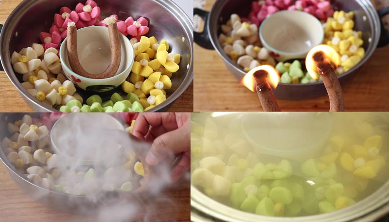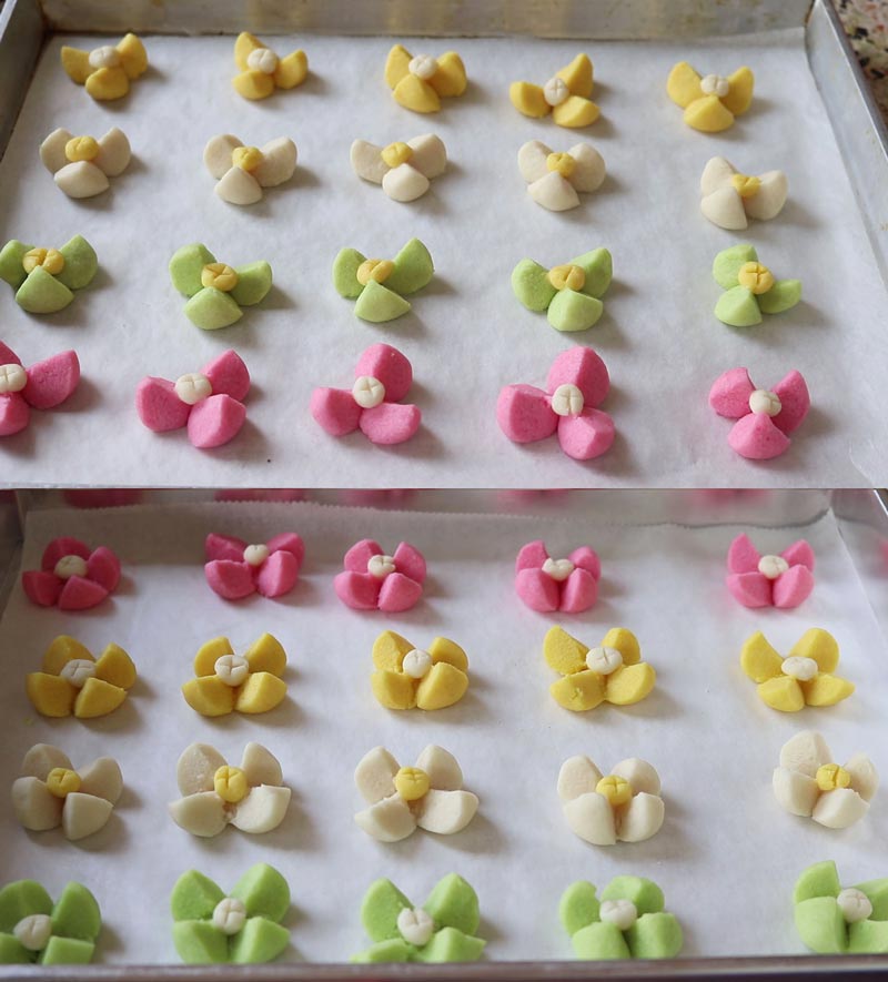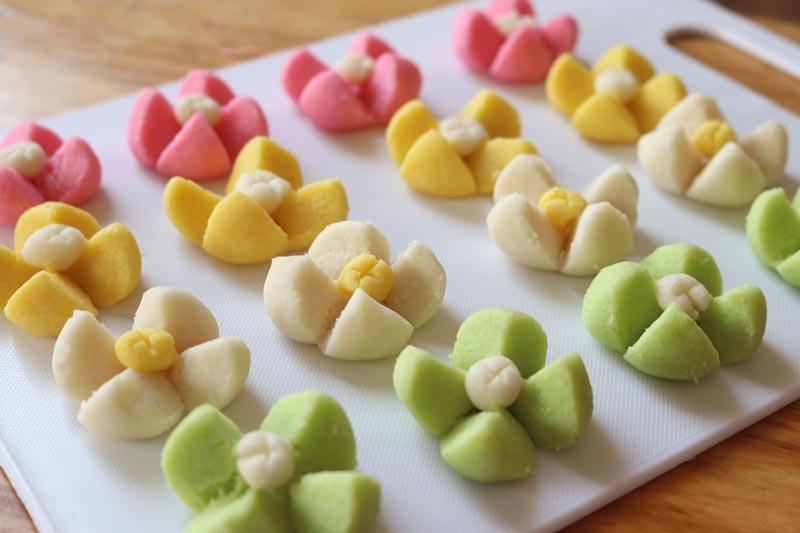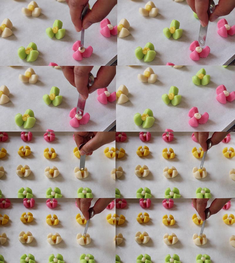 ► ปั้นเป็นลูกกลม ๆ ชั่งแป้งลูกละ 10-12 กรัม ผ่า 4 แฉก ทำกลีบลำดวน ปั้นเกสรเป็นลูกกลม ๆ เล็ก ๆ วางตรงกลาง