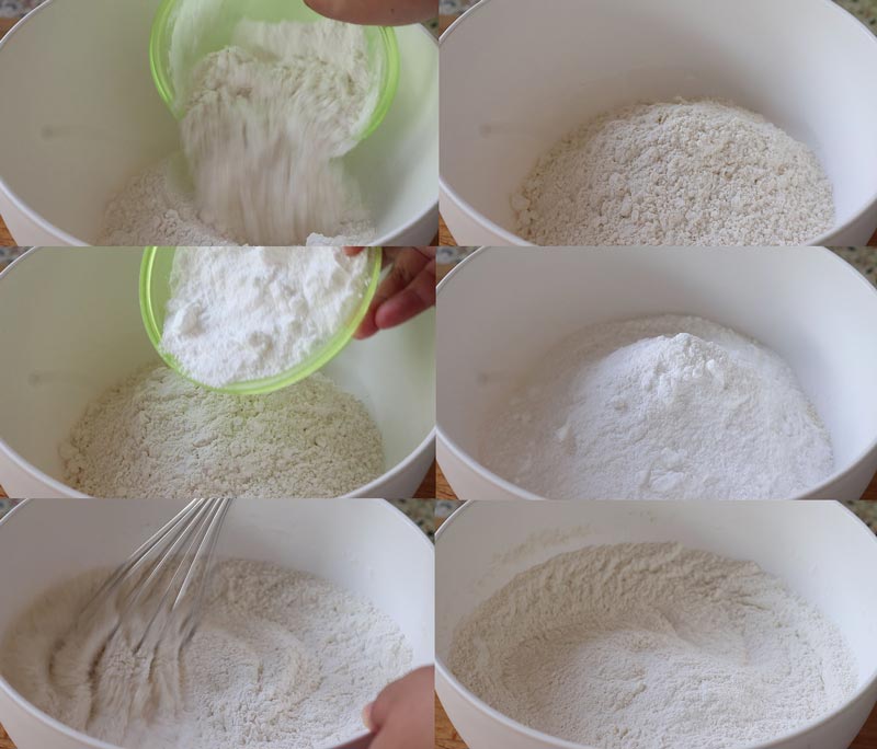 ► ผสมแป้งสาลีอเนกประสงค์ แป้งบัวแดง และน้ำตาลทรายป่นคนให้เข้ากัน