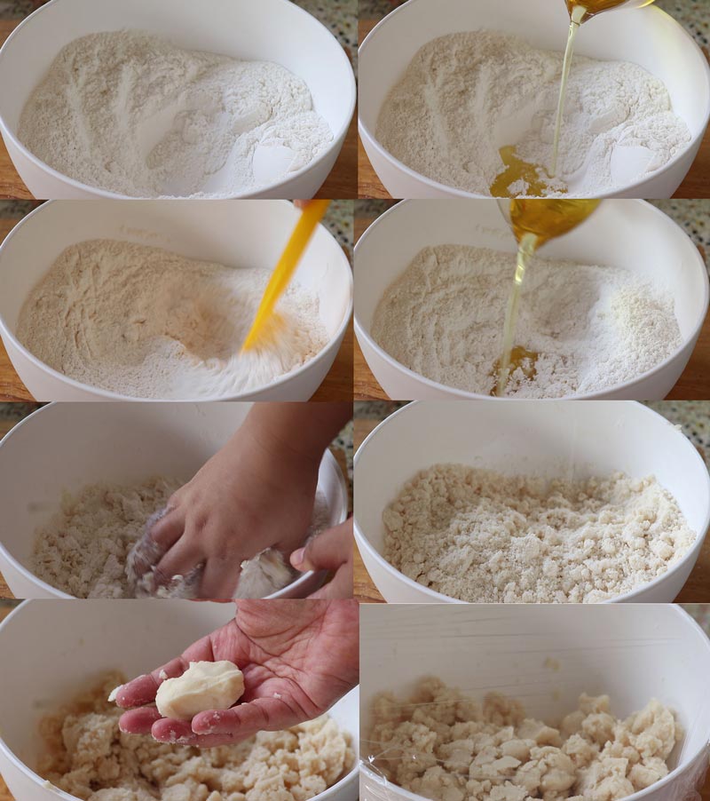 ► ค่อย ๆ ใส่น้ำมันพืชลงไป เอาไม้พายตะล่อม จากนั้นเอามือค่อย ๆ นวดให้เข้ากัน จนแป้งจับตัวกันเป็นก้อน จากนั้นพักแป้งไว้ 1 ชั่วโมง