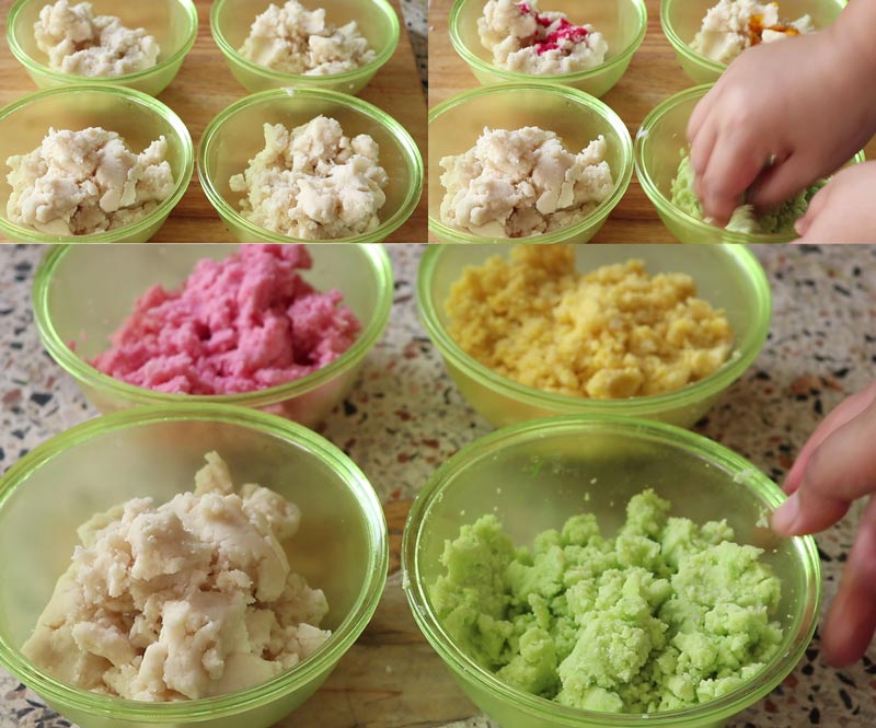 ► พอพักแป้งเสร็จแล้ว แบ่งใส่ชามผสม เติมสีผสมอาหารตามชอบค่ะ