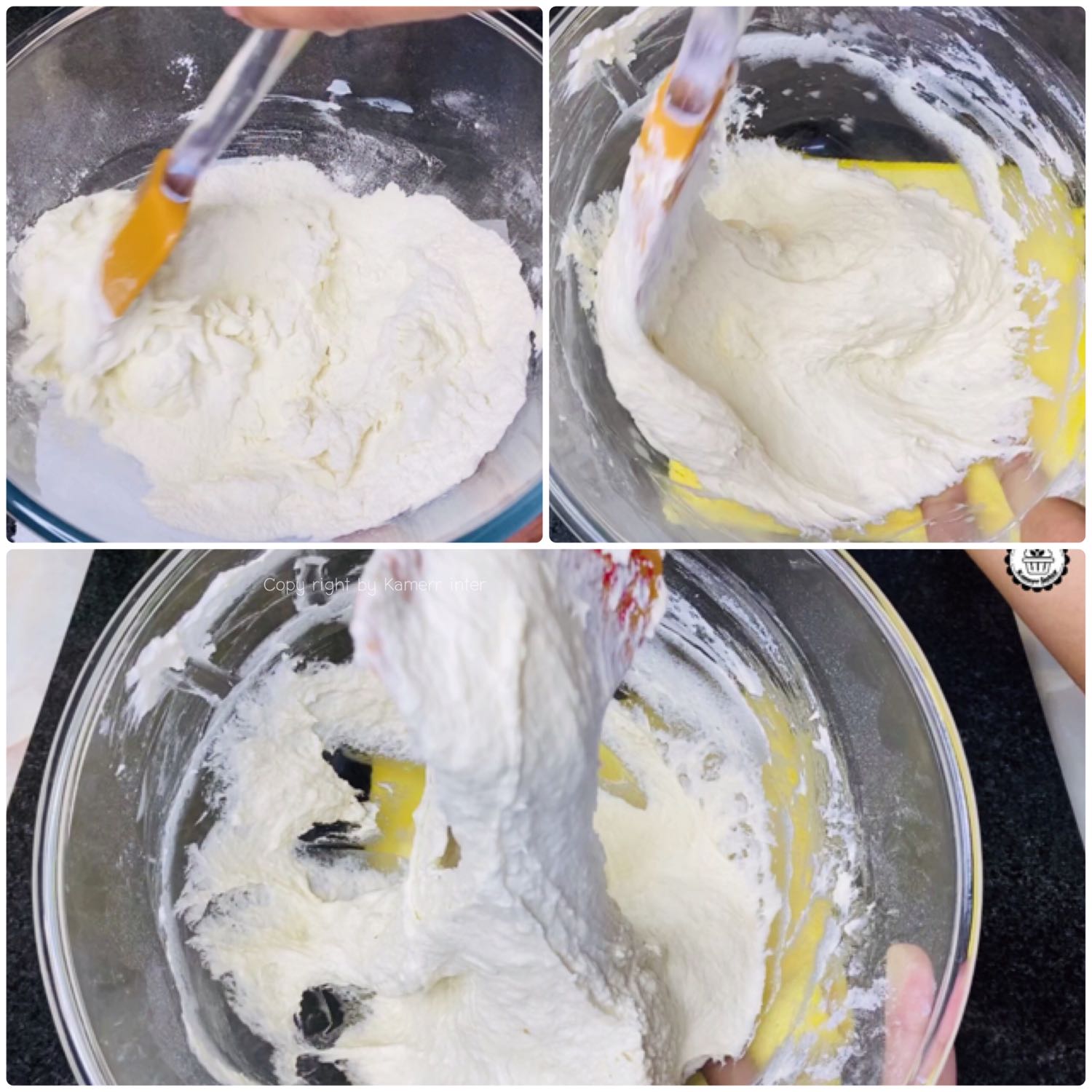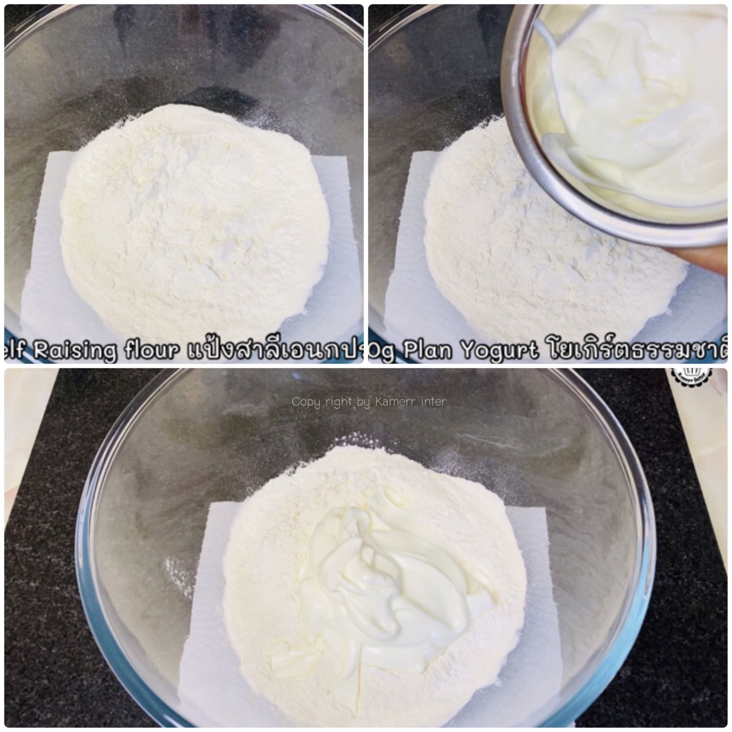 1. เทแป้งลงในชาม ตามด้วยโยเกิร์ตเลย จากนั้นค่อย ๆ คนส่วนผสมทุกอย่างให้เข้ากันดี จนมีความหนืด
