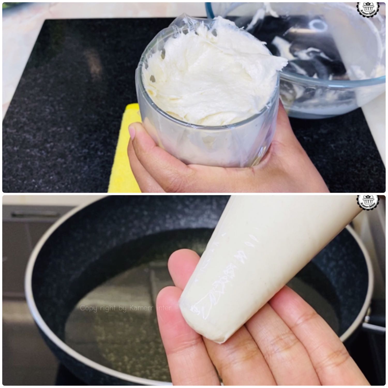 2. ตักใส่ถุงแกงหรือถุงอะไรก็ได้ตามสะดวก และตั้งน้ำมันโดยใช้ไฟกลางค่อนแรง (อย่าแรงมาก) ตัดปลายถุงเอาขนาดโดนัทจิ๋วตามต้องการได้เลย