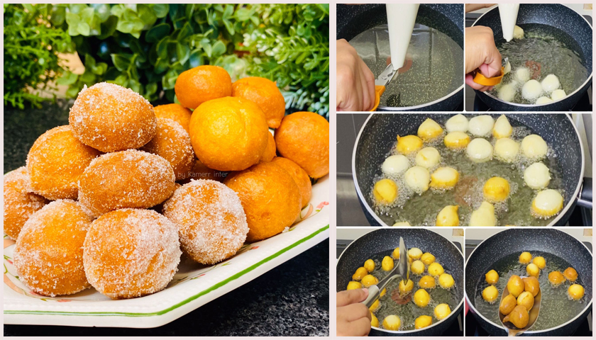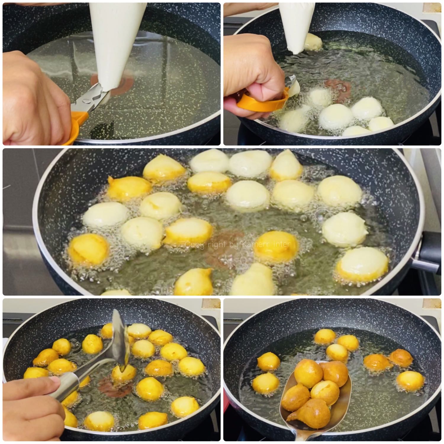 3. บีบแป้งและตัดลงไปทอดในน้ำมัน พอสุกจะลอยขึ้นมา ทอดจนสีเหลืองทองตักขึ้น นำไปคลุกกับน้ำตาล หรือไม่คลุกแล้วแต่ชอบเลย
