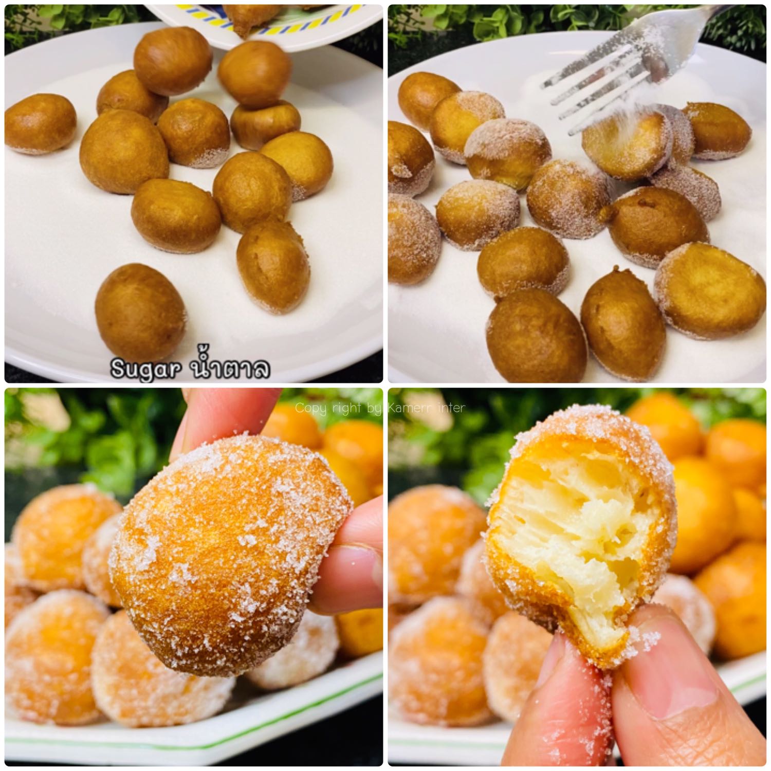 สูตรจาก คุณแขมร อินเตอร์ สมาชิกเว็บไซต์พันทิปดอทคอม ใส่แค่แป้งกับโยเกิร์ต เอาไปทอดจนสุก สุดท้ายโรยน้ำตาล
