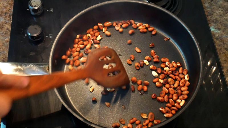 ◇ ตั้งกระทะใช้ไฟอ่อนเพื่อคั่วถั่วลิสงให้สุก