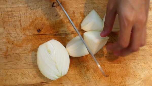 ◇ เตรียมหั่นมันฝรั่ง หอมใหญ่ และน่องไก่ เป็นชิ้นไม่ต้องเล็กมาก