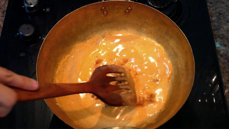 ◇ ผัดให้เข้ากันสักครู่หนึ่งแล้วจึงใส่หางกะทิ ตั้งไว้ให้เดือด
