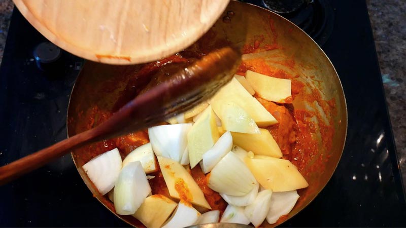 ◇ ใส่น่องไก่ลงไป ตามด้วยมันฝรั่งและหอมหัวใหญ่
