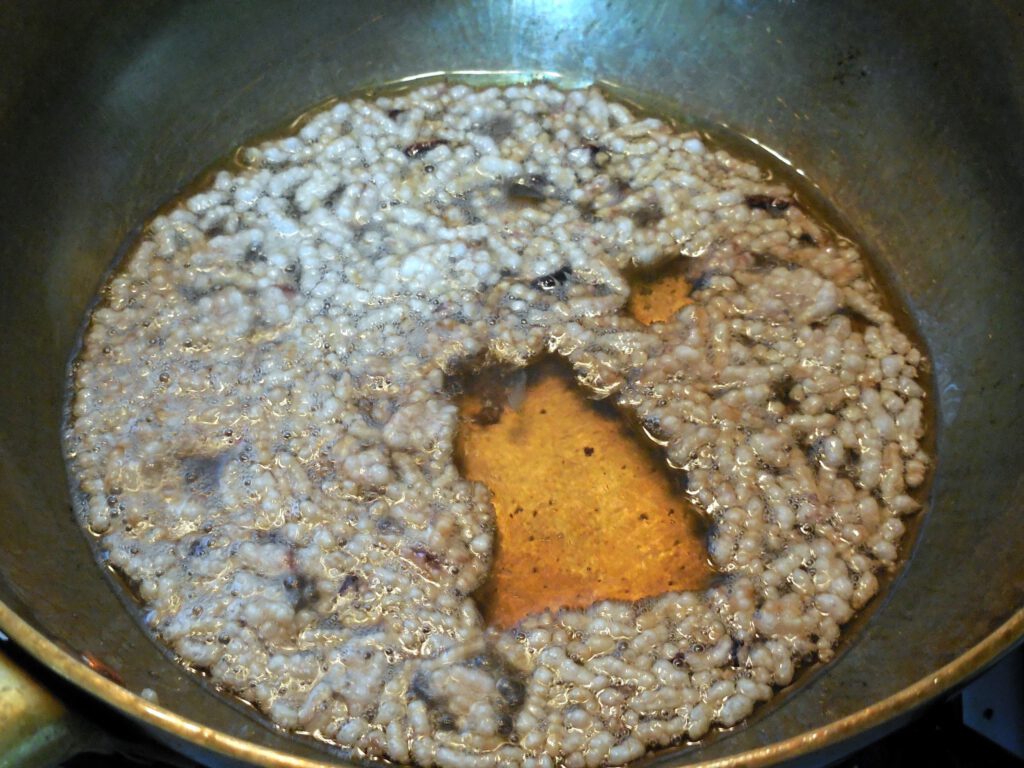 3.นำข้าวแห้ง ไปทอดในน้ำมันที่ร้อนจัด ให้ข้าวพองกรอบ ตักพักไว้ให้สะเด็ดน้ำมัน